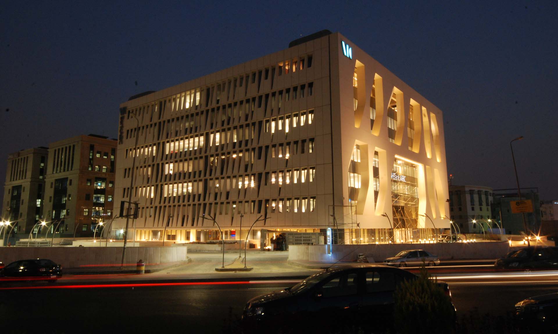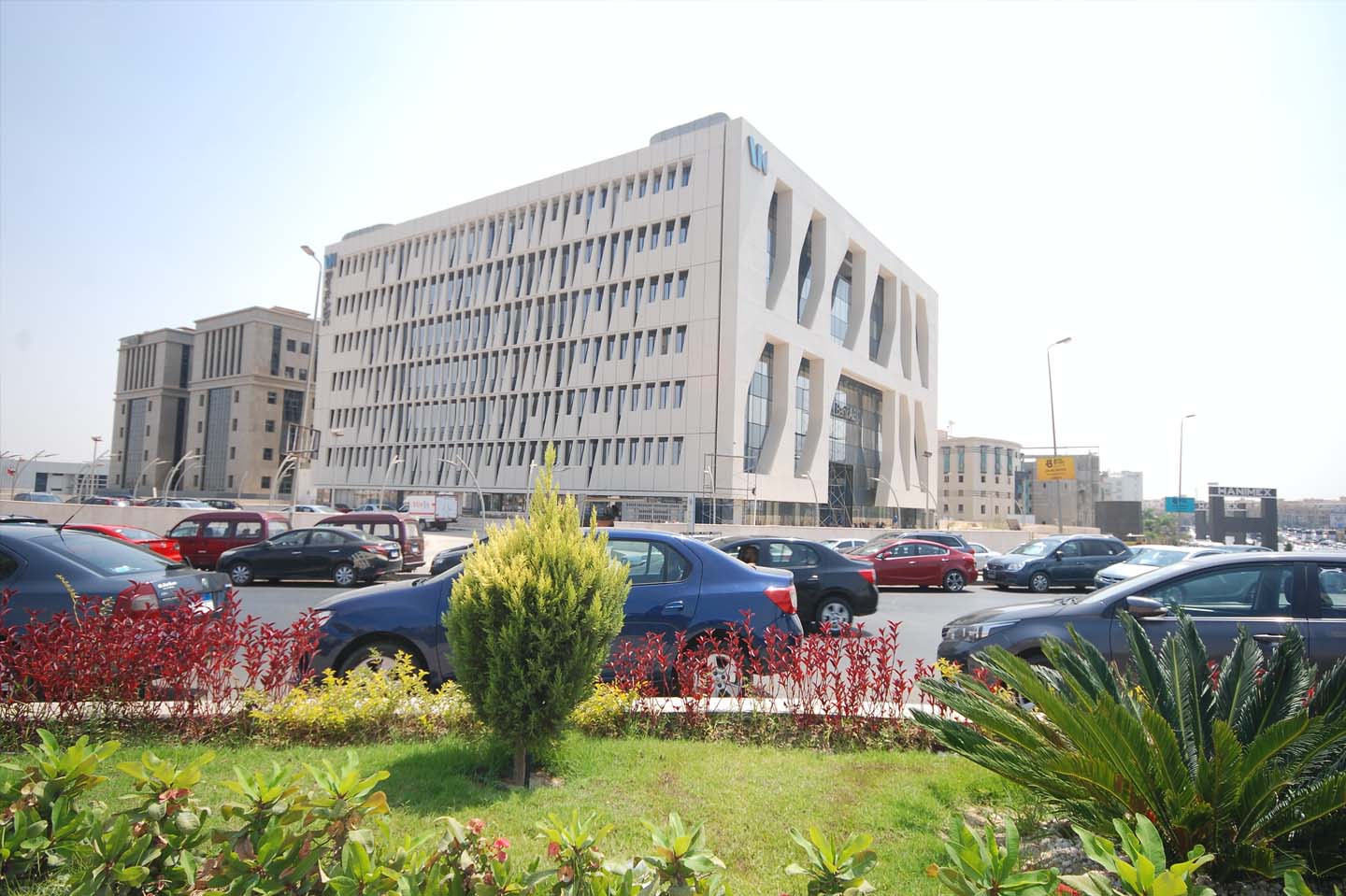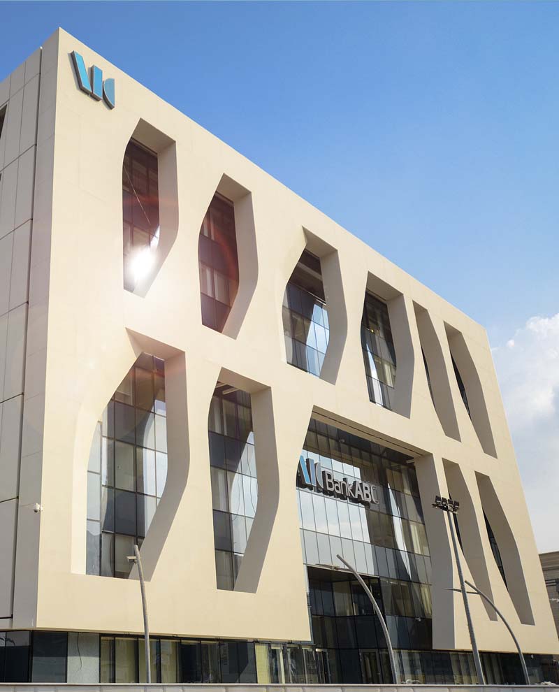 ABC Bank New Head Office Complex accommodates headquarters staff that were spread across different locations in Central Cairo. The new CAE Head Office Building is located on a plot area in New Cairo. The total built-up area of the project is 29,000 m2. The building emerges from an oasis of palm trees. The strong, regular geometry of the building is contrasted by irregular shapes of the surrounding landscape elements, namely, the palm trees and large boulders.